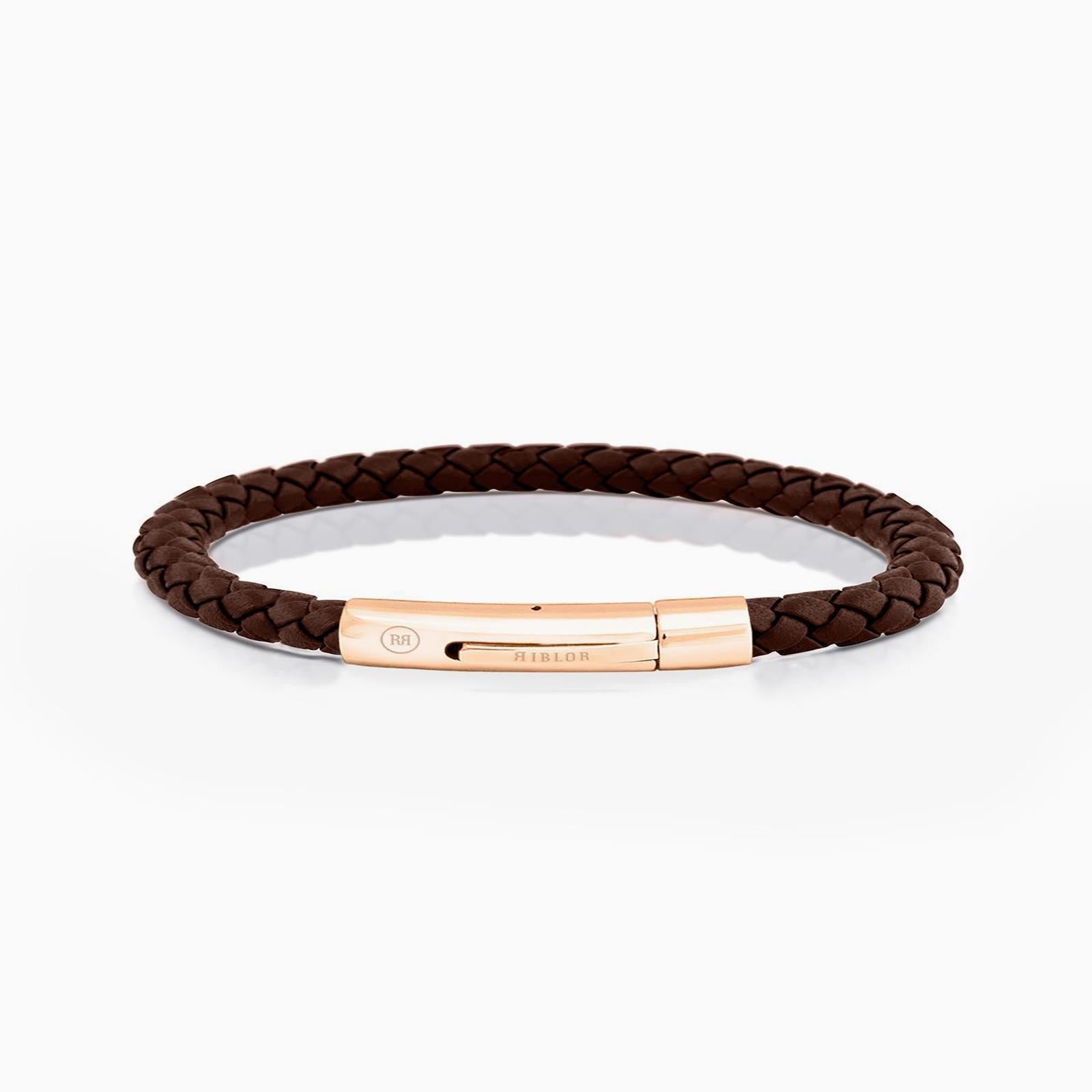 قم بترقية معصمك مع سوارنا الدائري مقاس 5 مم، المصنوع من جلد بني مضفر كامل الحبيبات، مع مشبك زر بلمسة نهائية من الذهب الوردي مع شعار Riblor.