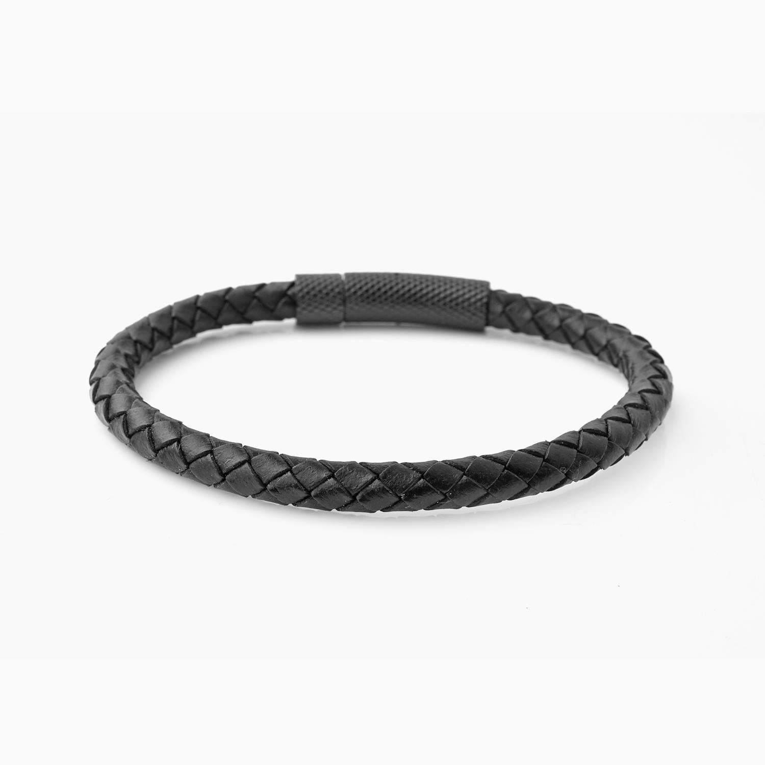 قم بترقية معصمك مع سوارنا الدائري مقاس 5 مم، المصنوع من جلد مضفر أسود كامل الحبيبات، مع مشبك زر ضغط أسود غير لامع مع شعار Riblor.